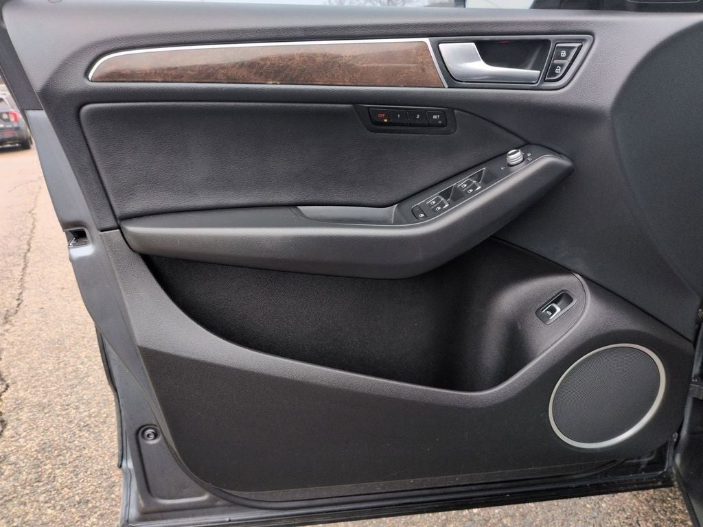 Check out all of the features on this 2016 Audi Q5 2.84 Axle Ratio, 4-Wheel Disc Brakes, ABS brakes, Air Conditioning, Alloy wheels, AM/FM radio, Automatic temperature control, Brake assist, Bumpers: body-color, CD player, Delay-off headlights, Driver door bin, Driver vanity mirror, Dual front impact airbags, Dual front side impact airbags, Electronic Stability Control, Four wheel independent suspension, Front anti-roll bar, Front Bucket Seats, Front Center Armrest, Front dual zone A/C, Front fog lights, Front reading lights, Garage door transmitter: HomeLink, Genuine wood console insert, Genuine wood dashboard insert, Genuine wood door panel insert, Heated door mirrors, High intensity discharge headlights: Xenon plus, Illuminated entry, Leather Seating Surfaces, Leather steering wheel, Low tire pressure warning, Outside temperature display, Overhead console, Panic alarm, Passenger door bin, Passenger vanity mirror, Power door mirrors, Power driver seat, Power Front Bucket Seats, Power Liftgate, Power moonroof, Power passenger seat, Power steering, Power windows, Rain sensing wipers, Rear air conditioning, Rear anti-roll bar, Rear reading lights, Rear seat center armrest, Rear window defroster, Rear window wiper, Remote keyless entry, Roof rack, Security system, Speed control, Split folding rear seat, Spoiler, Steering wheel mounted audio controls, Tachometer, Telescoping steering wheel, Tilt steering wheel, Traction control, Trip computer, Turn signal indicator mirrors, Variably intermittent wipers, and Wheels: 8.0 x 18 5-V-Spoke-Design.